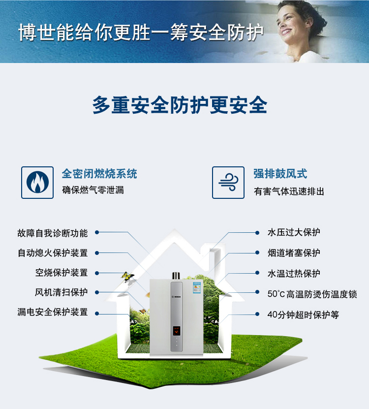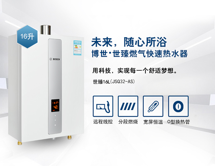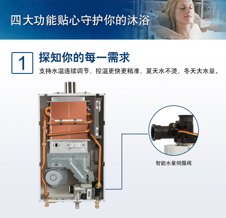 智能恒溫控制系統,超寬頻水量調節。通過搭載伺服電機,根據設定溫度連續調節水量,舒適節能到極致。一氧化碳探測報警器,細心呵護您的安全。更有多點控制,可連接兩個遠程遙控器, 控制更方便快捷。