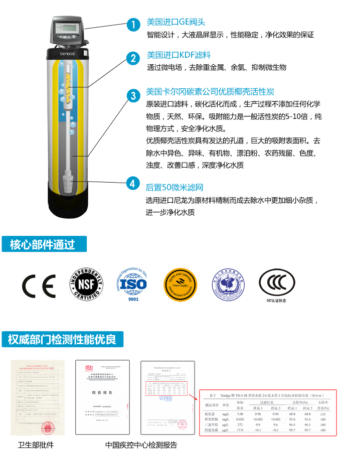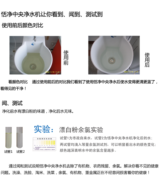 中央凈水機全自動垡頭有效去除水中的異色、異味;進一步濾除水中微小雜質、膠狀體;去除水中的漂白粉余氯、農藥、重金屬;保留對人體有益的礦物質。使水變得碧清、碧藍,去除對人體有害的物質。