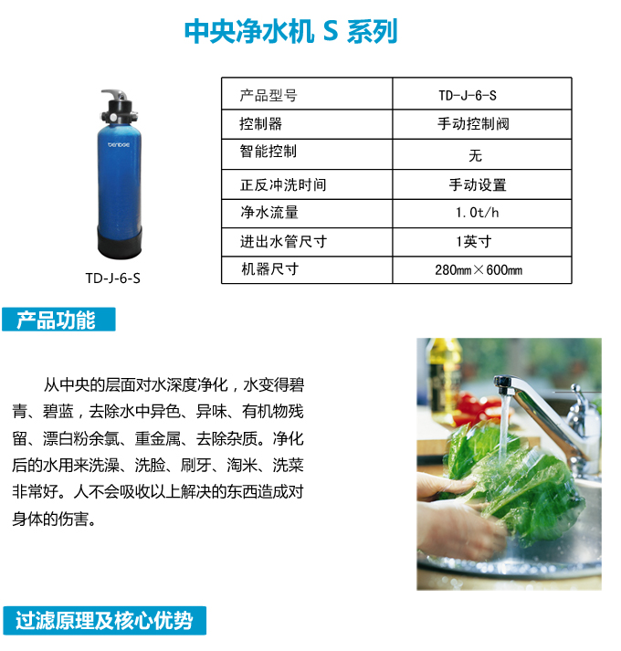 手動中央凈水機有效去除水中的異色、異味;進一步濾除水中微小雜質、膠狀體;去除水中的漂白粉余氯、農藥、重金屬;保留對人體有益的礦物質。使水變得碧清、碧藍,去除對人體有害的物質。