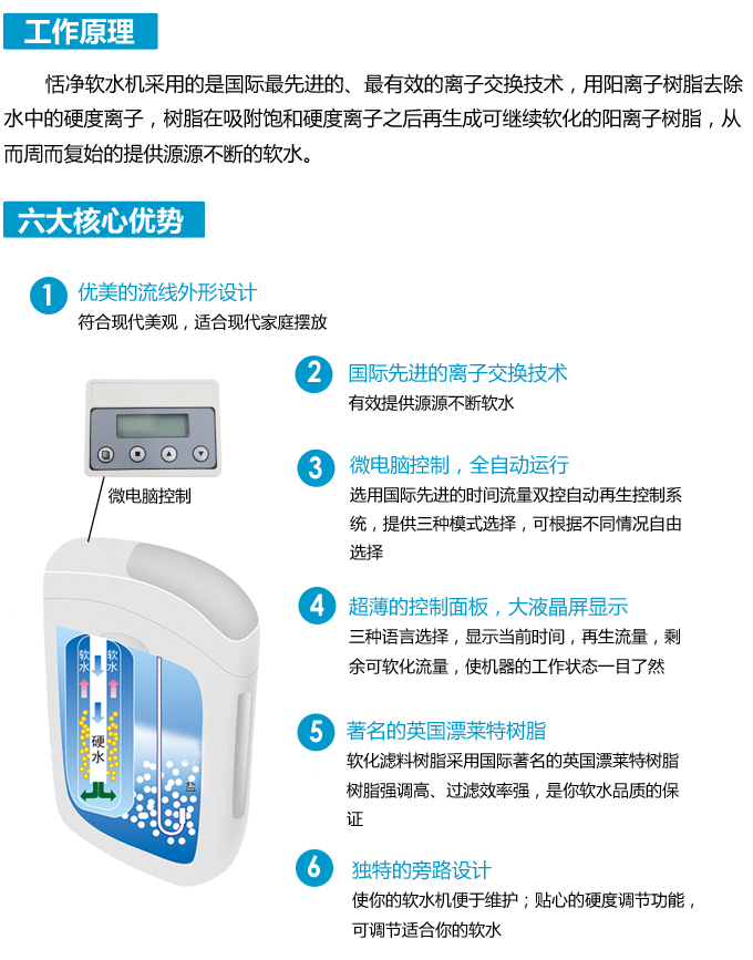 Tendge恬凈中央軟水機采用的軟水技術是目前最先進的、最有效的離子交換技術,采用離子交換技術去除水中的硬度離子,防止水垢生成并提高用水的舒適度。