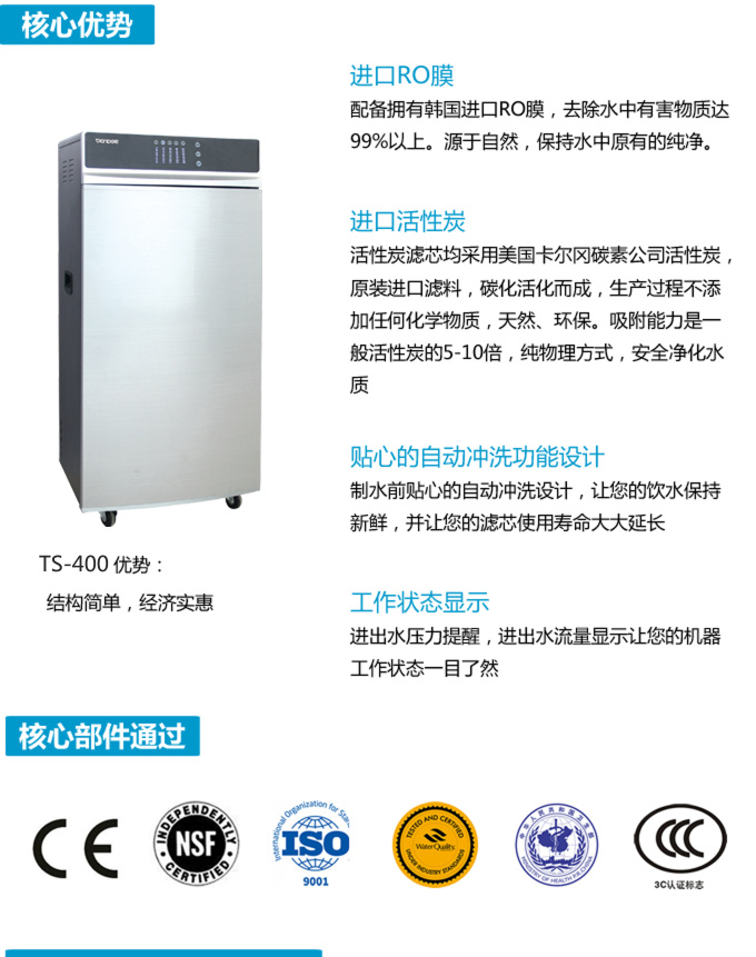 恬凈商用純水機可用于豪華別墅、辦公室、學校、茶樓等公共場所,解決公共飲水問題。恬凈商用純水機能夠去除水中所有有毒氣體及重金屬全部去除,水燒開再也不會結垢,口感甘甜,綿柔,讓飲用水更健康、更安全、更衛生。